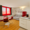 • Living area with sofa bed, flat-screen TV, and passion-red walls that add character and style.