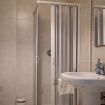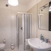 - a bathroom with shower and washing machine;